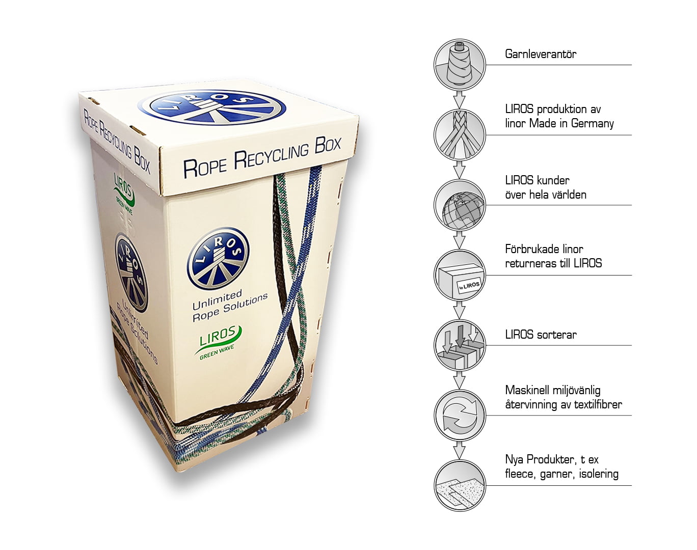 Med LIROS box för repåtervinning kan alla återförsäljare av LIROS Green Wave® erbjuda möjligheten att samla och återvinna gamla och utslitna LIROS -rep.